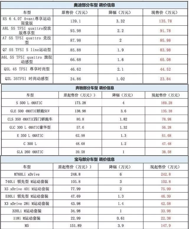 根据不同品牌及车型来看,奔驰最高官降6.4万元、宝马最高官降6万元、沃尔沃最高官降9万元......