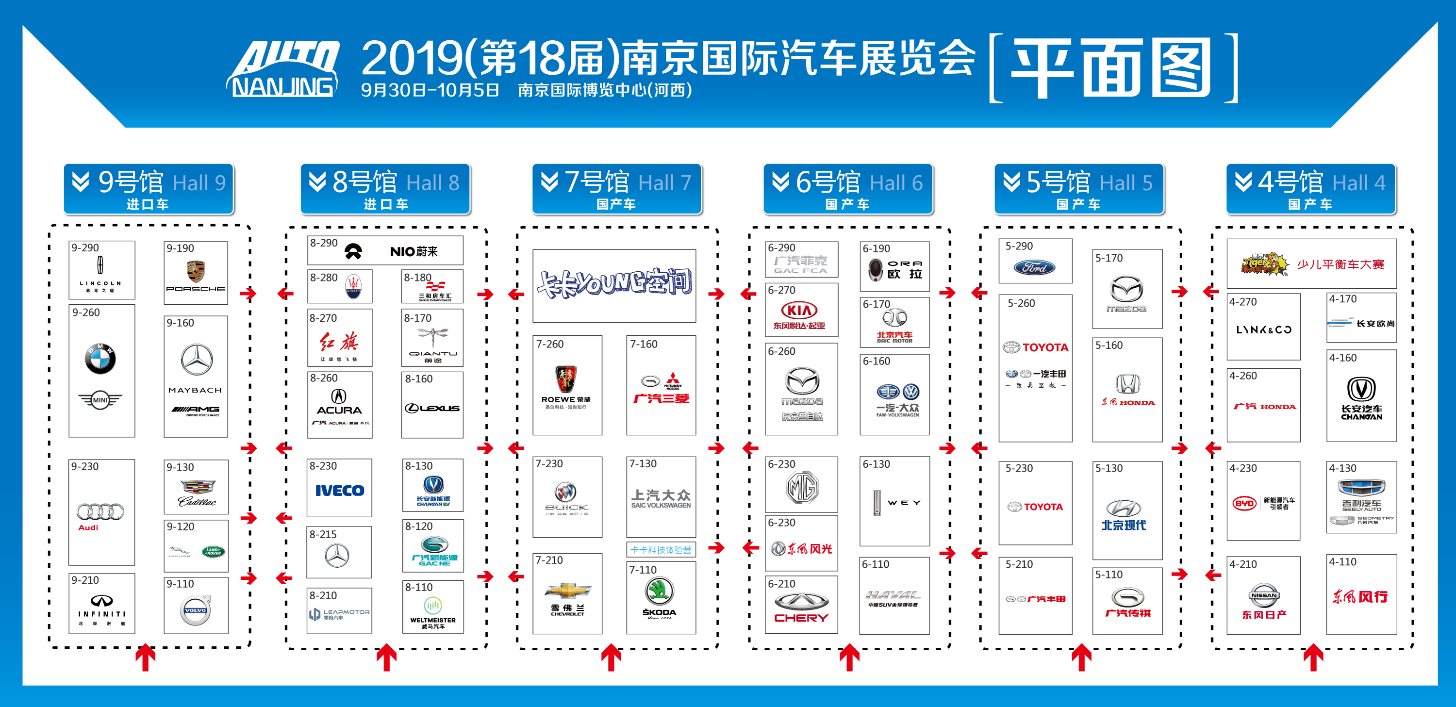 2019南京国际车展继续启用南京国际博览中心6大室内展馆和全部室外广场,总体展示规模超10万平米,吸引到场展商有:宝马、奥迪、奔驰、凯迪拉克、英菲尼迪、雷克萨斯、沃尔沃、林肯、捷豹路虎、Acura讴歌、保时捷、玛莎拉蒂、MINI、三和房车、奔驰商务车、长安马自达、北京现代、别克、一汽丰田、广汽丰田、丰田中国、斯柯达、广汽三菱、一汽大众、上汽大众、东风本田、东风日产、东风悦达起亚、长安福特、雪佛兰、一汽马自达、WEY、奇瑞、比亚迪、MG、荣威、广汽本田、哈弗、广汽传祺、吉利汽车、广汽菲克、广汽传祺、北京汽车、长安汽车、红旗、东风风行、东风风光、领克、宝骏、长安欧尚等等。
